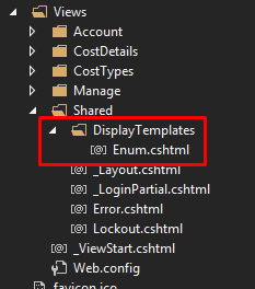 1- Shared klasörü altında > DisplayTemplates adlı klasör açıyoruz.> Enum.cshtml PartialView‘ını oluşturuyoruz.